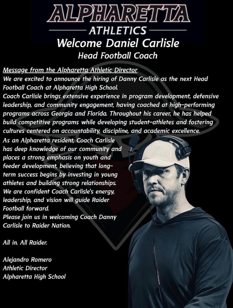 Welcome to the Alpharetta High School Football program! The Raider Football program is led by Head Coach Brian Landis and consists of 9th Grade, Junior Varsity, and Varsity teams. Our goal is to have an integrated program that includes parents, players, sponsors, students, alumni, AHS administration, and our surrounding community.